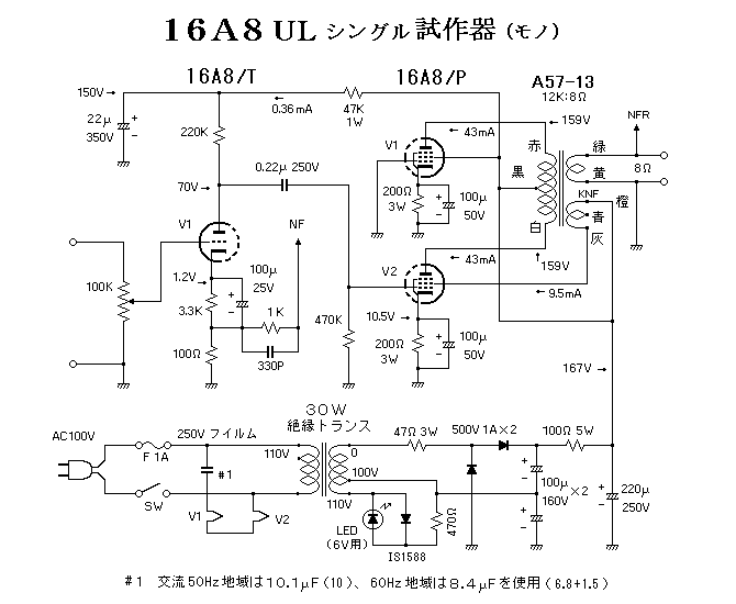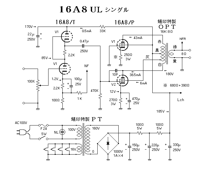なるのと、大型トランスは使わないという当初の趣旨から、回路としては廉価で小型の出力管16A8
