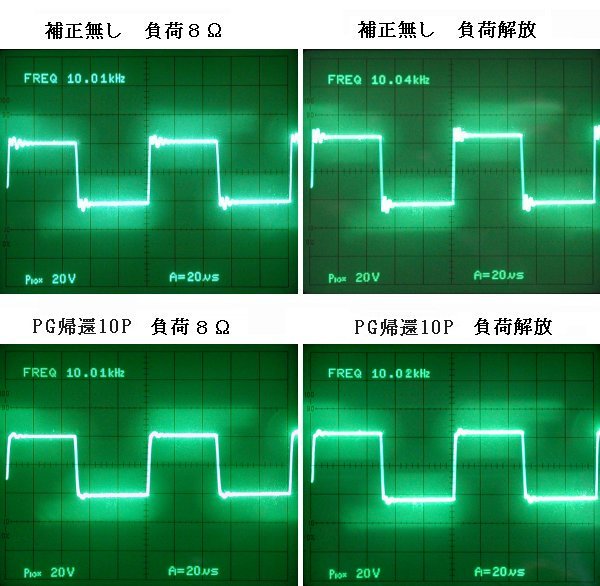 最後に方形波応答で補正の具合を確認してみました。補正無しでは周波数の高いオーバーシュートが