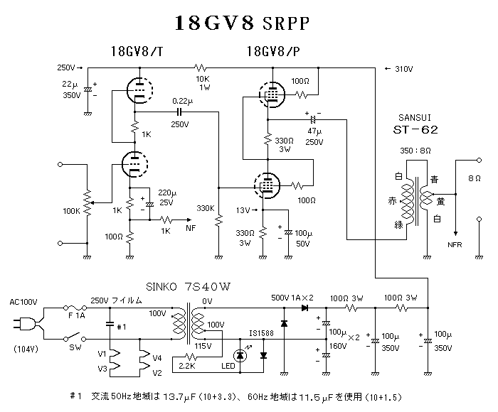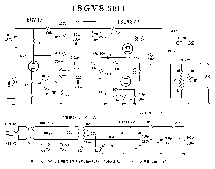 次2次直列のオートトランス式にする事で350Ω負荷としています。回路としては出力管の最大プレート