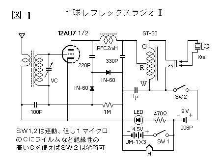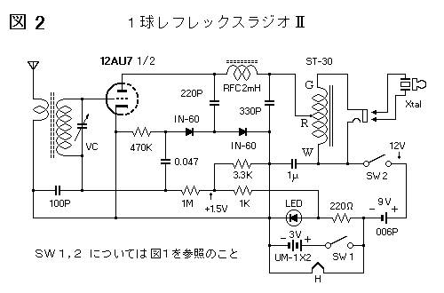 そんな折り、何と、トランジスター技術99年8月号に真空管式ラジオの記事が載っていました。 それは電池管を使ったレフレックス方式で回路も往年の高1ラジオのような複同調式でしたが、基 本的にはTr式に近い回路でした。(それにしてもトランジスター技術で真空管ラジオの記事とは なんと珍しい!)しかし、複同調には等容量でシールドのあるエアバリコンが必要で、安価なポリ バリコンは使えません。また球はたくさんあるので更に電池管を買うのも気乗りしません。球につ いては”JF1−OZLのページ”に12AU7を12Vで使用したセットが紹介されていました ので、この手で行くことにしてTr式の回路を低電圧の真空管式に置き換えるようにアレンジして みました。12AU7の片ユニットだけならヒーターも電池で間に合いそうですが、少しでも持ち を良くするために電圧を下げて使うようにしました。だいたい5V前後までは定格の6.3Vの場 合と同等に動作します。というわけで以下のような回路になりました。