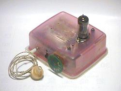 このセットのヒーター電流は約 100mAなので、性能の良くなった単一のアルカリ電池を使えば、 連続で5〜60時間、断続的使用ならば100時間近く持つのではないかと思います。また動作す るまでの時間はかなり長く約40秒ぐらいで、点灯中もヒーターはあまり赤くならないので代わり にLEDをつけています。ケースは電池がかさばって適当なのが無かったので奥の手のタッパーを 使いました。昨今流行のスケルトンケースと言ったところですが、かつてのラジオ少年達はとうの 昔からスケルトンケースを愛用していたのですよ。 ところで 今回のセットは大型電池を使っていながらイヤホーンしか鳴らせないので、始めに言ったように 実用性では疑問符の付くものです。しかし、このセットの球とソケット以外はTrラジオ用の部品 で出来ています。まあ12V電源なので当たり前ですが、今ではこれが大事なことなのです。 最近、真空管ラジオ用の部品は入手難で、たまにあっても大変高価です。特に5球スーパーを作 ろうと思うと部品集めで苦労してしまいます。ところが12Vまで下げなくても30V位で普通の 真空管が動作してくれれば、真空管式スーパーラジオの部品にTrスーパー用のIFTなどの部品 が使えるのではないでしょうか、今回はその為の予備実験の意味も兼ねて製作してみました。 |