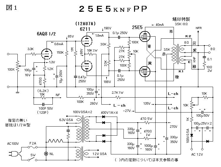 を得るというものでしたが、本機では初段に6AQ8、位相反転に6211、出力段に25E5を使う事