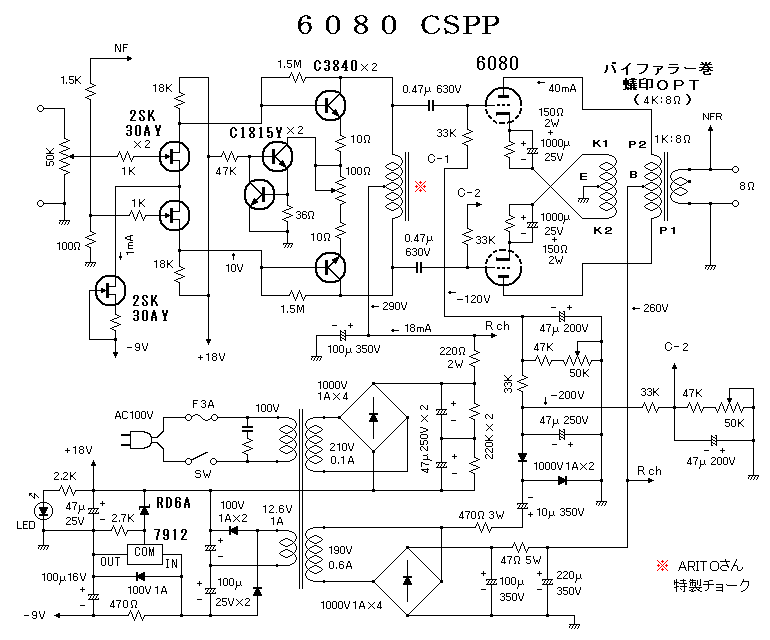 一方、6080(6AS7G)は10W級の出力管による双三極管で、これ一本で10W強の三極管PPアン