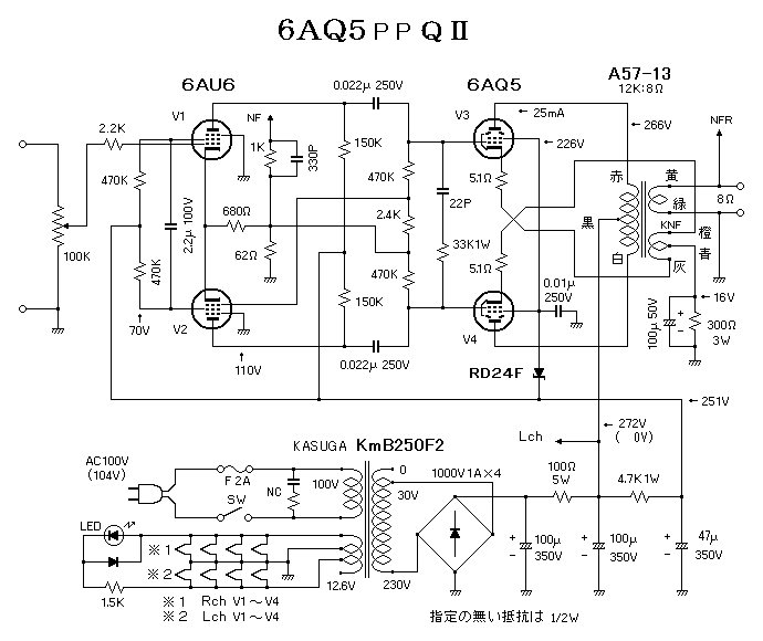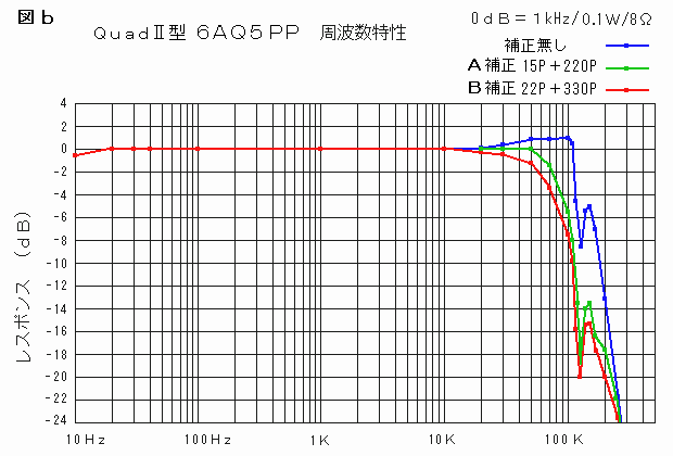 NFアンプの常道として、初段グリッドにパラ止めの抵抗を入れています。ただ、これも結局は補正を掛け