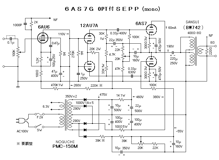 さて6AS7GPPの出力は本来ならば10Wは出せるのですが、本機の場合はいま少し下回