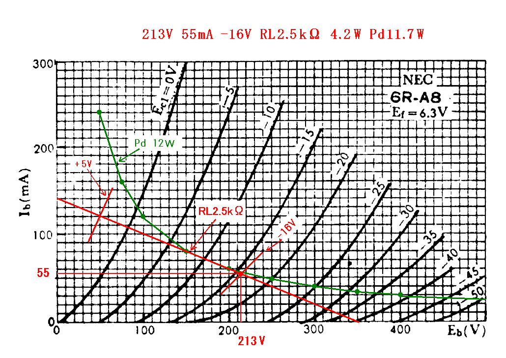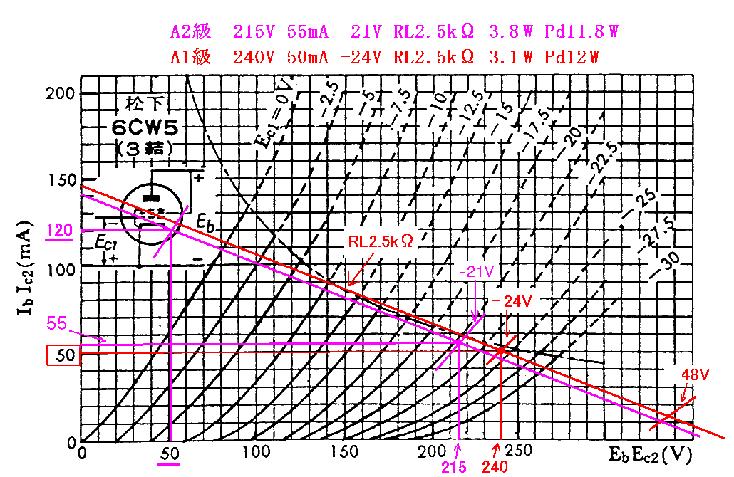 6CW5三結のグラフにRL2.5kΩロードラインを引いてみたところ、計算上では3Wの出力が得られ