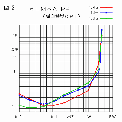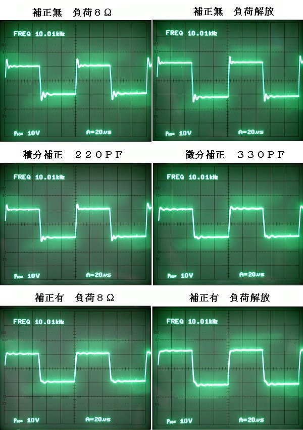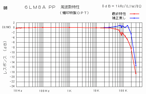 6LM8A PP 試作レポート 前章のアンプを思い立った時に、当初考えたPK分割式位相反転回路でも特性を採っていたので、オートバランス型への途中経過という事で、以下に纏めてみました。 なおOPTにはチョロQトランスを使っていますが、いつも試作セットに使っていた並品トランスは、何度も使い回して換装される度に、リード線は短くなり足の爪は折られて、当バラックセットに取り付ける為に足を元に戻して折り返そうとしたら千切れてしまいそうだったので、もう一組の未使用の方の並品トランスを使う事にしました。このトランスは並品にしてはアバレの少ないものですが、6U8A類似管6LM8Aとの組み合わせで特性を採りました。回路としては以下のようにオーソドックスなもので、出力段はOPTに合わせてKNFにしています。 ![]() これも電源についてはこの回路図とは違って絶縁トランスで供給しています。一方、6LM8Aはプレート損失が6U8Aなどより一回り大きいと思われるので、B電圧はもっと上げても大丈夫だと思いますが、そうすれば出力的にも有利になりチョロQトランスの能力をよりいっそう生かせるでしょう。 諸 特 性 ![]() 歪率については、今回はさほど 重視していないので、追い込み も十分ではなく、あまり素直な 特性にはならなかったのですが それでも2Wまで低歪みを維持 しています。また低出力側も球 を選別して残留ノイズを減らせ ば、もう少しは低歪みになると 思います。 無歪出力2.1W THD1.3% 1kHz NFB 約6.9dB+KNF DF=4.8 on-off法1kHz 1V 利得 15dB(5.6倍) 1kHz 残留ノイズ 0.66mV つぎに周波数特性を採ってみたところ、並品チョロQとの組み合わせなので、やはり少しアバレがありましたが、微分補正330PおよびOPTの1次側に積分補正220P+4.7kを入れたところ、以下のように盛り上がりを押さえる事が出来ました。 ![]() さらに方形波応答を観測すると、やはり補正無しではオーバーシュートが目立ちましたが、不思議な事に負荷解放でもオーバーシュートの高さには、あまり変化がありませんでした。つまり高域のスタッガ比がきちんと取れているので、たとえ多少のアバレはあっても回路としては安定しているという事かも知しれません。このあたりの事は、もっと特性の悪いトランスで試してみればはっきりするのですが、それでも少しは他の並品トランスの参考にもなると思います。個々の補正については微分補正の効果が大きいようでしたが、念のために積分補正も入れると以下のようにほぼ整った波形になったので、これで最終特性としました。 ![]() NF量が少なくて出力も少ないという事で、当初狙っていたチョロQトランスを効果的に使う、というレベルには達しなかったので、いつか6GW8のようなもっと高感度高出力な球で再度の実験をしたいと思います。 ただ、前章のオートバランス型と較べると、トランスが違うので単純には較べられませんが、私はPK分割式よりもオートバランス式の方が様々な面で好ましいように感じました。データー的に一番大きな違いは裸利得で、オートバランス式の方が2倍の利得になる分、NFも多く掛けられて有利になるのではと思います。