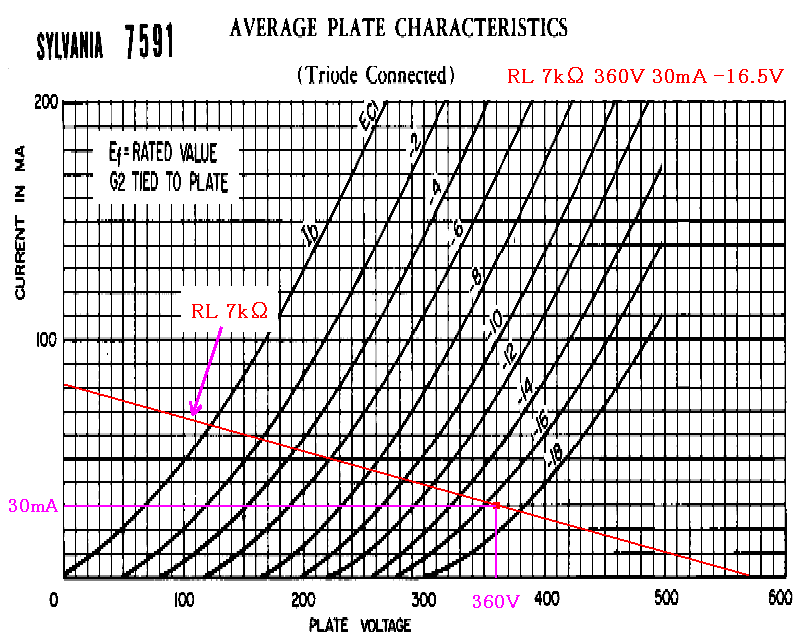 の作例でも三結シングルアンプの製作例は見当たりませんでした。それでも試しにロードラインを引いてみ