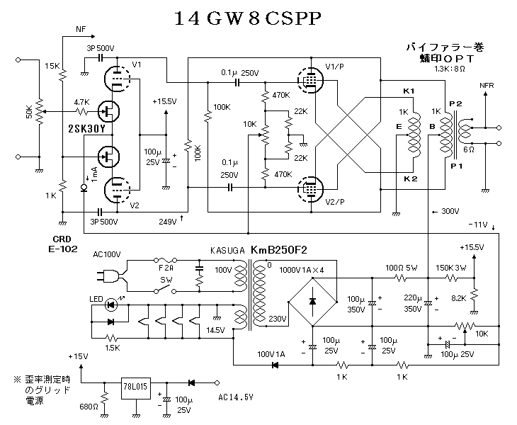 この回路では出力段のプレート巻線とカソード巻線が同じ巻数なので、出力管には出力電圧の半分もの