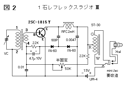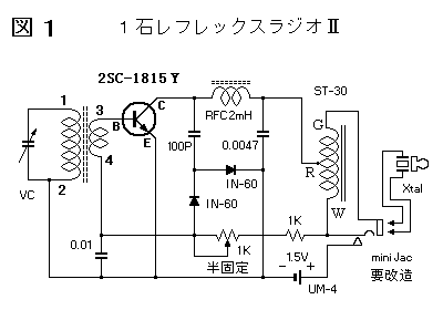 前章の一石トランジスターラジオは、元はかなり以前に造ったものなので、そこに使われている部品が入手 しづらくなってしまいました。そこで現在最も一般的なNPN形の石を使って1石レフレックスラジオを組ん でみました。また問い合わせ等もありましたので製作方法も簡単に解説しています。