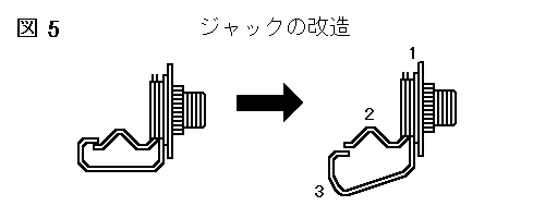 イヤホーンジャックは電源スイッチを兼ねるようにする為、少し改造が必要なので図5を参考にして下さい。