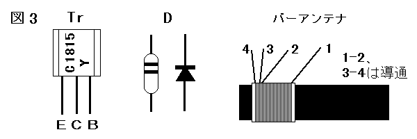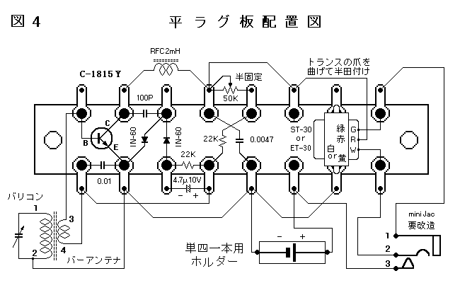 前章の1石レフレックスラジオを、なるべくそのままの回路で2 SC−1815Yに置き換えると 図1のようになります。バイアス 抵抗が極端に低くなっているのは、 シリコンに比べてゲルマニューム ダイオードの順方向電圧(注1) が少ないからです。また検波信号 はこのバイアス抵抗を通って逃げ てしまうようで、一応動作はしま すが感度はあまり上がりません。 そこで改良したのが下の図2です。ダイオードに直列に抵抗を入れてバイアス電流があまりダイオードに流 れないようにしています。一方、検波信号はケミコンを通ってベースに流れ再度増幅されます。 ![]() 本器の場合トランジスターが 高増幅度の石なので、最大感度 では、ほとんどの場合発振して しまいます。そこで発振しない ように動作電流を絞り増幅度を 下げるようにします。小電流領 域では、ほとんどの石で電流が 減少すると増幅度(hfe)も 下がります。また帰還が掛かる ようにバイアス抵抗を出力トラ ンスのRから接続しています。 このセットの動作電流は大体0.3mAなのですが、バイアス抵抗値は石のバラツキにも左右されるので半固定 抵抗で調節するようにしました。石もなるべく C−1815のYランクの石を使って下さい。同等でも違う 石を使う場合はバイアス抵抗値が大きく異なるかも知れません。 一般に1〜2石のトランジスターラジオを作る場合、穴あきのユニバーサル基板を使うことが多いのですが、 初心者の方はラグ端子板を使う方が作りやすいでしょう。図3にトランジスターなどの足の接続を、また図4 にラグ板の部品配置の一例を載せていますので参考にしてみて下さい。
