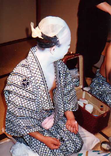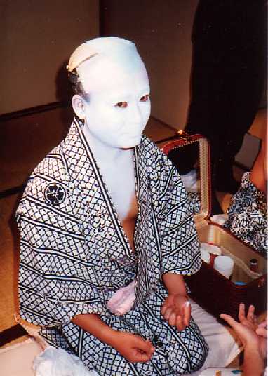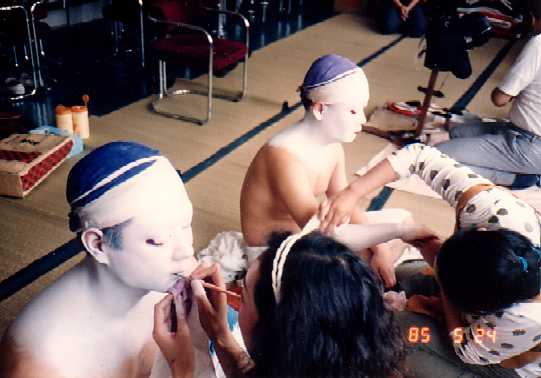 お化粧風景です。 自分では出来ませんので顔師さんにやってもらいます。 だんだん白く塗り上がって衣装をつけてカツラをつけると みんなしばらくは鏡の前でボーっとしています。(^o^) 白塗りはどこか魔力がありますね。