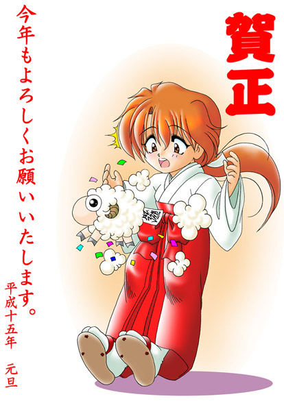 [年賀状(平成15年)@和泉水流様] 今回はコミカル路線ですね。 巫女さんとヒツジさんがとっても可愛いこの年賀状を和泉さんから頂きました。 和泉さんには毎回、贈答作品と扉絵、そして感想メールお返しCGと 3つの作品をお持ち帰りさせて頂いてます。 そのサービス精神にはホント脱帽です。