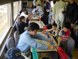 プラレール♪プラレール♪GoGoトミカ、トミカっ! 5号車、6号車はプラレーラー割り当て車輌ですので 乗車後すぐに、レールの埋設作業が始まります。 各テーブル間をつなぐため、「大鉄橋」が大活躍です。 |
