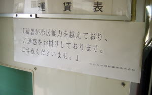 注意書き 車輌の中の注意書きです。 「猛暑が冷房能力を超えており ご迷惑をおかけしております。 ご容赦くださいませ。」 いいです、いい仕事しています。(笑 関西の通勤車輌でこれやったら暴動が起きるかもかもですな。 |