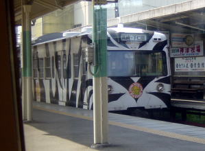 あっシマウマ! 途中高崎駅で、おもしろい車輌を発見。 動いている「ゆう」から激写! 帰宅後、調べてみると上信電鉄の車輌とのこと。 ボデーには、「群馬サファリパーク」と書いてあったと思います。 おもしろい塗色ですね。 |