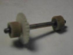 ![]() | 「ええいっ!」とばらしたところです。 アドバイスを頂いた方の通りで、以外とパーツ少ないです。 このシンプルな機構で往復が可能だとは...すごいですね。 右下のギア付きの軸に小ゴムがありますね。 硬化していると言うよりも、「これゴムか?」ってな感じです。 |