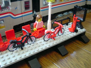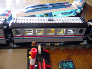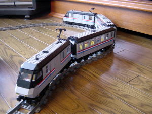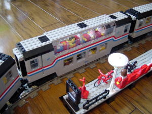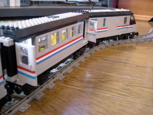 うひょひょひょひょひょ カーブを曲がってくる4両編成がたまりません。 Metrolinerセットは3両セットで、Railroad Club Carを繋げて4両編成です。 これね、実にいいです。大きさがいい。手になじむ大きさで遊ぶにも手ごろです。 パンタグラフも付いているのですが、シングルアームです。>くうー泣かせるね。 LEGOってこういう小物もきちんと作ってます。 |