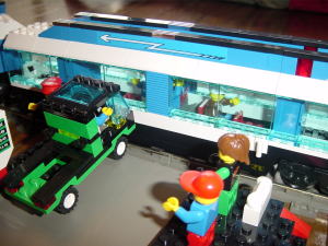 客車その2 Railroad Club Carでセットとは別物です。 2階建て(ダブルデッカー)車輌で屋根はセンターから割れて左右に開くように なってます。 他の車輌もそうなんですが、トリコロールのライン部分はドア部を除いて 薄いブロックで表現されています。>細かいです。 これまた、息子とケンカしながら作ったのは言うまでもありません。 |