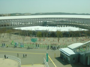 リニモ車内より、万博会場駅到着寸前 おおっ広い広いよ。 でも、人が溢れ返ってはいないよ。 大丈夫かな?万博? がんばれ万博! |
