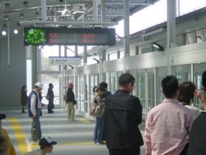 愛知高速鉄道:万博八草駅構内 どこかで見たような感じです。 そう、ポートライナーの駅と似た感じで車両到着時に 開く自動扉となっています。 愛知環状(愛環)の駅と接続しており、移動途中のコンコースには 乗車客には、多すぎるほどの警備員ならびに案内係の方々が 方々にいらっしゃいます。 |