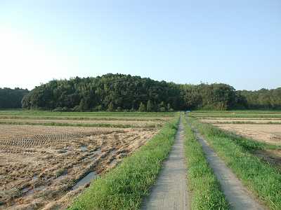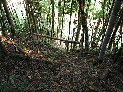 | 訪問記 | [2004/09/12]丘陵の南東端に登り道がある。道を登っていくと左手に段郭状の地形が見えてくる。その西側には谷が入っている。竪堀はそのさらに西側から始まる。東側の竪堀は幅が狭いが西側へ行くほど箕のような幅広の形状になっていく。この丘陵の谷津を挟んでさらに西側の丘陵南面にも竪堀群があるが、こちらはあまり明瞭でない。今日は確認しなかったが、東側丘陵にも何かがあって当然な感じがする。 |
