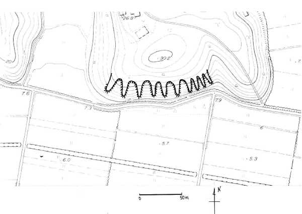 | 概説 | 阿波龍貝城の西方約450mの丘陵南面に構築された竪堀群で、同城となんらかの関連を持った施設と考えるのが自然だろう。比高およそ15mの丘陵南面に10本の竪土塁が構築されている。 |