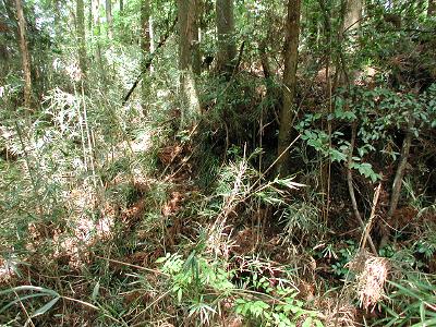 | 訪問記 | [2005/05/09]東京電力大洋変電所の裏山が城址。ものすごい藪で写真も何が何だかわからない。余湖さんによると方60mほどの単郭居館らしいが、今日は全周を歩くのはやめた。変電所の中へ土塁と堀が入り込んでいたようで、その部分をブロックで示すという工夫がしてあった。調査が終われば敷地内は何事もなかったかのように平に均してしまうことが多いが、ちょっと好感を持った。 |