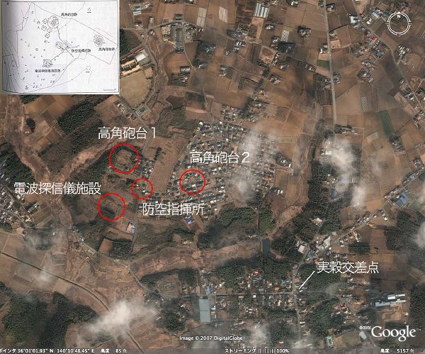 | 概説 | 霞ヶ浦海軍航空隊基地の防空を担当した高角砲陣地。97年、98年に調査が行われているので資料はあるはずだが、手元にないのでGoogleEarthの航空写真を手に現地を歩きながら推定してみた。従って写真に記入した位置は正確ではありません。 |