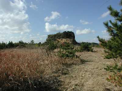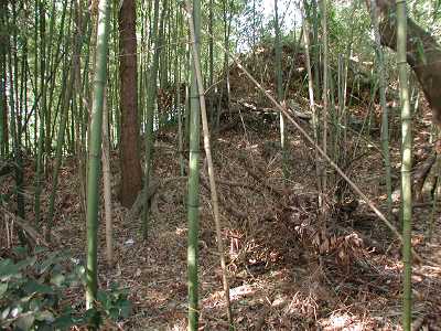 | 訪問記 | [2004/01/06]「粟生城入口」標柱の所から入っていくと内御城と外城を境する切り通しになる。崩れやすそうな土質のためちょっと気持ち悪い。登り切ったところから先はものすごい藪。その先へ行くとおそらく御城になるのだろうが、そこは土取されているので断崖絶壁だったのではないだろうか。外城北側の八幡神社・平光寺周囲には大きな土塁が残る。平光寺から城の東縁土塁に沿って南へ降りる道がある。土塁の内側の城域はごっそり土取されている。外城の南端部で土塁が切れた所から御城へ入ってみると土取されて何もない空間。遙か前方にジョンフォードの西部劇『駅馬車』で見るモニュメントバレーのような取り残しの山が見える。おそらく、西側「粟生城入口」の所から入って行った切り通しの内御城側の削り残しだと思う。無惨! |