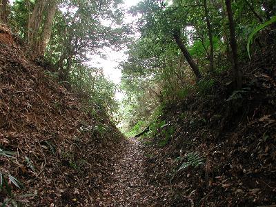 | 訪問記 | [2003/11/04]本丸の南側に薬研堀の堀切を挟んで三の丸がある。三の丸の東側犬走りを土塁に沿って南へ進むと右手へ渦を巻くように三の丸内へと導かれる。敵まで導いてしまって良いものか、それとも誘き寄せるための仕掛けか? |