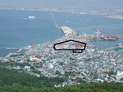 弁天台場の位置を輪郭線で示しました(函館山山頂から)![]() |