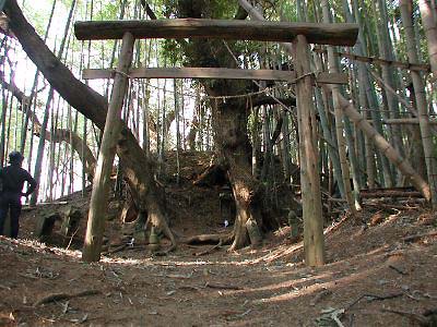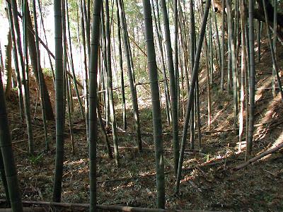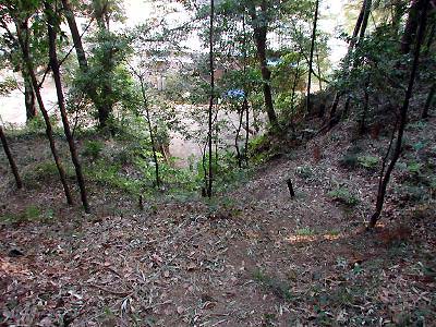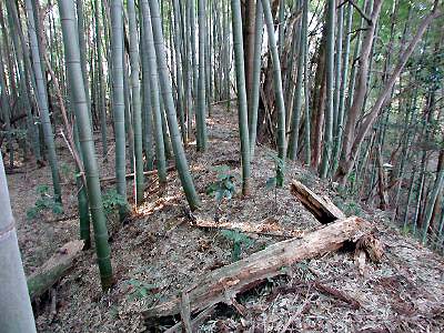 | 訪問記 | [2002/03/10]西光寺側から民家の間を通り畑を抜けると籔の向こうに南北方向に堀切が見えて来た。堀切沿いにしばらく南へ進むと堀切を横切る土橋が見つかる。土橋を渡った正面に大日山である櫓台がある。堀切の東側が郭になっていて土塁で目隠しされている。内部は祠の礎石が散乱する小山と浅い溝以外は特別何もない。郭の東側に沿って土塁が巡らされている。下記の資料によると堀切の西側には城郭の遺構は無いとのことだが、西側の台地のくびれをもう少し堀切等で切っておけば防御も堅くなるのではと感じてしまう。 |