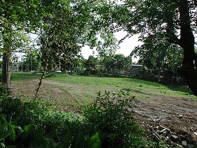 | 訪問記 | [2001/05/07]二の丸の地でお話をしてくれたおばさんによると、二重堀はつい1、2年前に埋められたとのこと。写真2の左手に見えるこんもりとした塚は二重堀の中央の土塁の残存。眼下の堀底はその時まで水をたたえていて鈴ケ池と呼ばれていたとのこと。 |