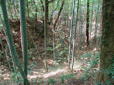 | 訪問記 | [2005/04/18]『重要遺跡調査報告書II(城館跡)』では、北端の松尾神社のある郭を三の丸、その南側の方形の郭を本丸、さらにその南側の長方形の郭を二の丸としている。しかし、南側の街道監視のためにも普門寺のある台地まで城域にしておくべきではないだろうか。もう一つ、土塁の位置についても疑問がある。本丸といわれる部分の辺縁に土塁が無いのは構成の改変であるのか。反対に二の丸と三の丸の本丸側に土塁があるのはなぜだろう。これでは本丸から周辺曲輪の内部が見にくいではないか。 |