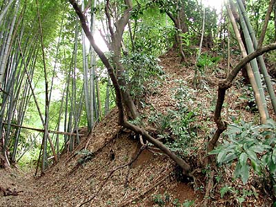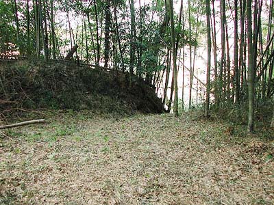 | 訪問記 | [1998/04/20]本城は宅地造成工事中。南側の土塁も分からなくなっている。 [2000/11/13]畑の脇を登るとすぐに右手に巨大な土塁があり、そのすぐ奥に平行してもうひとつの土塁がある。その奥が本城跡だが薮がすごくて近付けない。左の竹薮を進むと古墳や別の土塁があった。1998年4月20日に来たときには本城部分は宅地造成中だったのだがその後放置されて藪へ戻ってしまっている。ただ単に遺構が湮滅しただけの造成工事だったわけだ。 |
