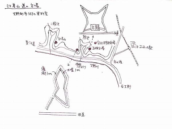 | 訪問記 | [2002/7/15]大野町郷土資料室で場所と現況を聞いたところ土取場になっているとのことだったが、一応現況写真を写しに行った。「台場の位置模式図」は郷土資料室で参考資料としていただいた塚原善記歌文集『臥牛山』の挿絵を写させていただいた。ただし、突出沢方形台場の位置は私が追加したことをお断りしておきます。 |