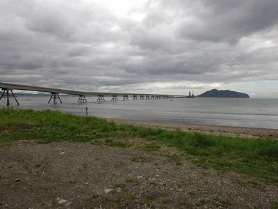 - 上磯のセメント・ベルトコンベアー(上磯町) 函館湾沿いに国道228号線で上磯を走ると陸から海上へ突きだした長〜いベルトコンベアーが目に止まります。これは上磯町にある日本セメント工場から海上に浮かぶ運搬船へ直接セメントを積み込むためのものです。およそ1800mほどありそうです。函館山までつながっているわけではありません。