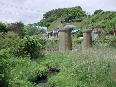 - 旧戸井線(函館市・戸井町) これは「壮大なるトマソン」と呼ぶべき物件です。かつて函館本線五稜郭駅から戸井町市街を結ぶ支線が計画されました。すでに大正9(1920)年に軍当局と鉄道院はこの区間の調査を終了しており、当初から軍事的要因はあったものの、地域発展のためとする期待も大きく、昭和11年工事に着手した。しかし昭和18年、戦局の悪化に伴い、基盤工事をほとんど完成しながら中止されたとのこと。地図を眺めると現在は一般道路や遊歩道になっている旧戸井線のルートが幻のように浮かび上がってきます。この写真は汐泊川に架かる橋の橋脚になるはずだった物体。