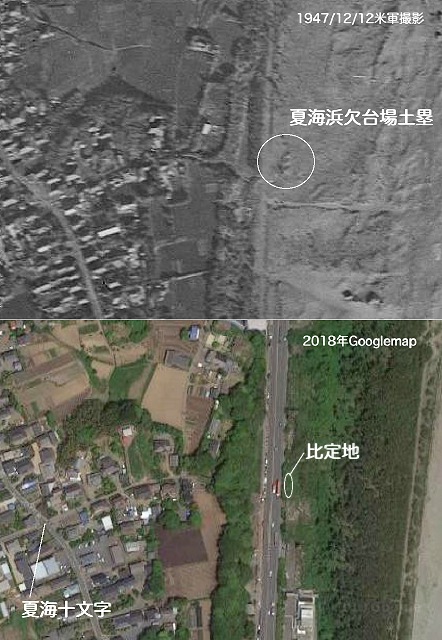 | 訪問記 | [2004/04/26]国道の場所だったのか、それよりも海側の場所だったのかさえすでに分からなくなっているそうだ。『大洗町史(通史編)』に砲台場跡略図が載っている。それによると松川陣屋から夏海十文字を経て塩見塚の南を国道51号線へ降りた真正面に円筒形の土塁3基描かれている。それに対して『大洗町埋蔵文化財包蔵地調査カード』ではそこから100mほど北側に比定している。この辺りは国道の両側にホテルや商業施設が建ち並び遺構を探す余地はない。しかし、『大洗町史(通史編)』の図の場所であったら一部でも残っている期待が持てる。 [2004/05/31]『大洗町史(通史編)』の図の場所を歩いてみた。国道51号線沿いレストランひたち野と釣具屋の間は全てブルで押されてアスファルトで固められている。その東側はすぐに斜面になって海の方へ下がっている。遺構に関してはほぼ絶望だ。 [2018/10/25]1947年撮影の米軍の空中写真に3基の土塁らしきものが写っているので、現在のGooglemapと並べて場所を比定してみた。 |
