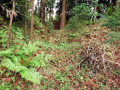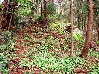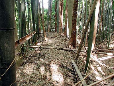 | 訪問記 | [2000/11/13]本郭のある南側を歩いた。君原公民館を右手にみて直進すると道は左へ曲るが、その角に案内板がある。しばらく直進し山道へ入って行き少し右へ降りるように左へ廻り込んで行くと土塁の切れ目になる。左へ進むと稲荷社のあるたてと呼ばれる二の郭跡がある。二の郭の西に本郭跡がありその西側土塁の外側に畝堀がある。 [2001/04/23]今日は、塙をたまたま通りかかったので畑で作業をしている方に「裏山の三重の土塁や堀を見たいのですが登れますか?」と尋ねたところ、偶然にもその裏山全部を持っていらっしゃるご本人でした!そしてご親切にもご本人に案内していただき、すばらしい三重の土塁を堪能できました。もし竹が刈られてきれいに整備されていたらここはものすごい遺構ではないでしょうか。 |