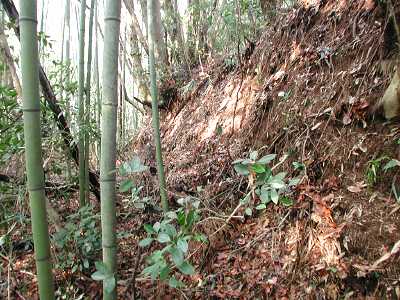 | 訪問記 | [2005/01/11]城址部分には住宅があるようで「関係者以外立ち入り禁止」の立て札がある。その少し先に堀切のような堀跡がある。ここに堀切があるのは理に叶ってはいる。ちょっと失礼して少し奥まで入らせてもらったが城館遺構らしきものは見当たらなかった。 [2005/01/17]以前、潮風さんと五郎さんが外郭部の遺構(潮風さんの『常陸国の城と歴史』より)を確認されていたということだ。今日は台地南端部の水田の所から斜面を登ってみた。幅10mほどの帯郭が廻っていた。帯郭に沿って西側へ回っていくといつの間にか辺縁部に土塁が現れ横堀になっていた。帯郭に見えたところもかつては土塁があったのかも知れない。 [2005/04/10]広憧院の北側150m辺りで道が食い違いになっている部分があり、そこから東西に堀切があったと思われる。東西へ道を少し入ると土塁と堀の跡が見られる。ここが外郭の北縁部となる。 |