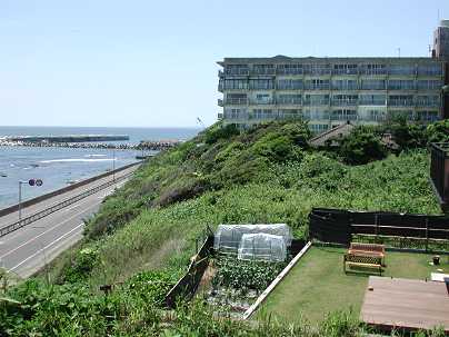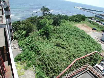| 訪問記 | [2004/06/14]『写真集那珂湊市史』に名前が挙がっている東塚原台場だが、場所は不明と聞いていたので、とりあえず『那珂湊の地名』のわずかな記述をたよりに歩いた。東塚原は現在の殿山町の旧地名なので、殿山地区で海に面して台地の張り出している場所を探してみた。リゾートマンション「サングリーンなかみなと」南側の駐車場が気になったので海際の藪に入ったところ土塁が見つかった。駐車場を造成するときの単なる削り残しの可能性もあるが雰囲気的には土塁である。 |