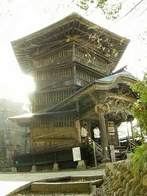 :国重要文化財で、上りも下りも階段がなく、1度通った所は2度通らないで上がって降りてこられるという、なんとも不思議な建築物。(→