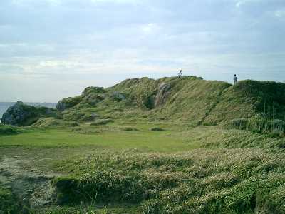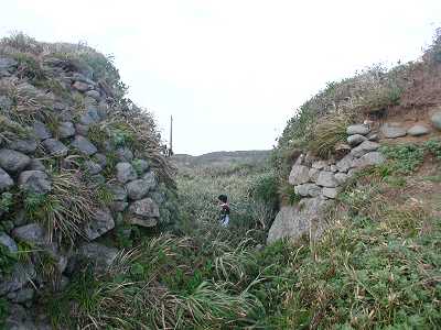 | 訪問記 | [2004/09/19]『利根川図志』の「仙ヶ岩」というのは現在の千騎ヶ岩のこと。犬若の岩場が台場だったということはいまのところ聞いていないが、台場・要塞だったとしても不思議でない場所だ。最上部には個人が住んだときの風除けにしては大きすぎるくらいの、郭の趣がある土塁を回している。風光明媚かも知れないがそこまでして住むものだろうか。木製の電信柱が残っているからやはり誰かが住んでいたのか?郭のように土塁で囲んでいる。土塁のように見えるし内側から見ると石塁のようにも見える。 |