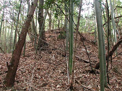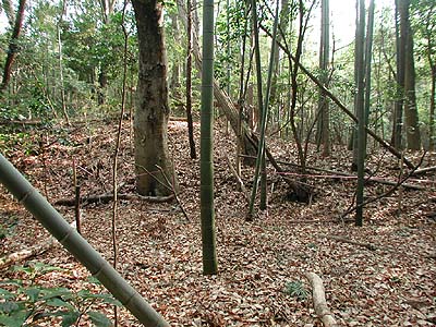 | 訪問記 | [2002/1/15]新館中学校の東方にある円明寺あたりから城跡の気配がある。さらに東へ進むと周囲を土塁に守られるように民家が並ぶ。その先、民家と籔が切れて畑になる所の左手の籔の中に周囲150m程の本丸跡と思われる遺構がある。 |