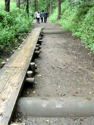 | 訪問記 | [2005/10/11]さいたま市立博物館およびさいたま市立浦和博物館で始まった、さいたま市・岩槻市合併記念事業特別展『戦国時代のさいたまー城と館からさぐるー』を見に行ったついでに、寿能城とここ岩槻城へも足を伸ばした。 福祉会館(イグレッタ)、野球場、生涯学習センターにかけてが新曲輪、第三駐車場から菖蒲池へはもともと湿地が入り込んでいたようで、菖蒲池の南側の小高い部分が鍛冶曲輪。二つの曲輪はともに比高二重土塁で囲まれていたらしい。新曲輪の南東側で障子堀が3本確認されている(本物は3m下に埋め戻された)とのことだが、堀の中に仕切の畝が何本か入れられていて、これは障子堀と言うよりも畝堀ではないだろうか。 岩槻駅近く、愛宕神社が祀られている場所は大構の土塁の一部らしい。周辺はまったく残っておらず、ここだけが大きな塚状になっている、 |