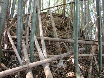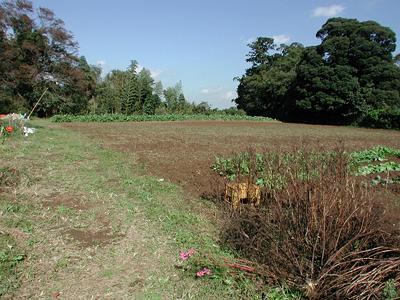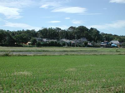 | 訪問記 | [2002/10/07]今日は詳しい場所が分からず遠望のみ写した。 [2002/10/22]下根本の熊野神社の北約200mにある稲荷神社の祠の裏側に虎口と思われる大きな土塁が左右に迫る。現在主要部はNさん宅の敷地になっているようだ。方角的にこの稲荷を鬼門の守りとしていたと思われる。稲荷は江戸崎土岐氏の守り神だったことから最終的には土岐氏方の地だったということだろう。 |