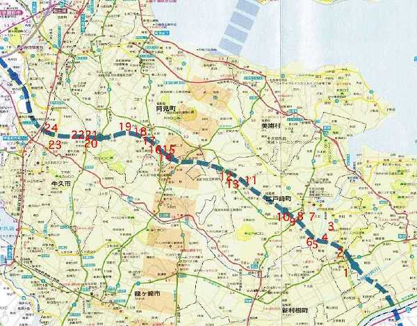 しかし、2003年3月末につくばJCT・つくば牛久ICが開通し、さらにそこへ繋がる稲敷郡内の計画部分の橋脚工事も所々で始まってきたのに気づく今日この頃。美しい稲敷の風景の中を走りながら、伐採が始まった舌状台地の肌を目にして、圏央道通過が現実味を帯びて感じられてきた。今はまだ美しい風景の残っている稲敷だが、数年後同じ場所に立って風景を眺めたとき私たちはどんな感慨を持つのか。せめてもの慰みに、まだ高架道が架からない最後の風景をここに収めておくことにした。そして、何年か後に稲敷の新しい景観をこのページに追加してみたいと思う。[2003年12月15日]